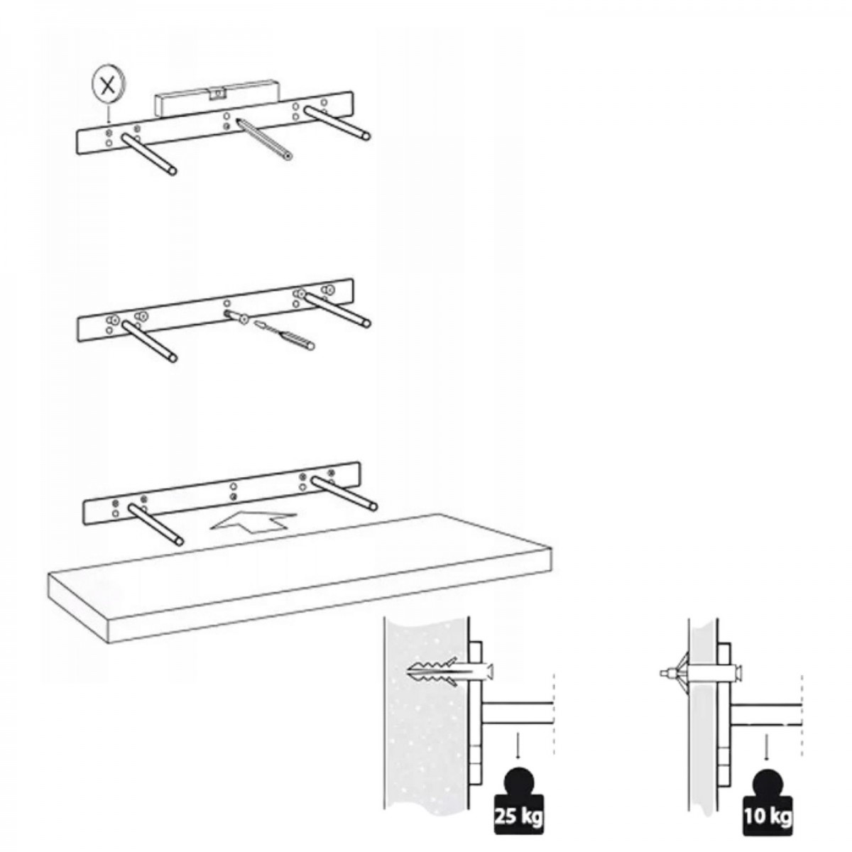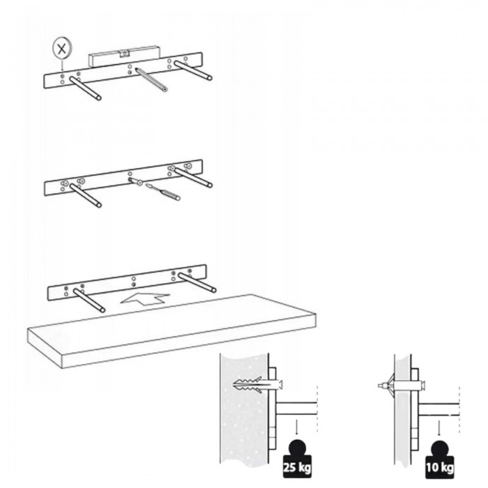 Komplet składa się z półki, wspornika i zestawu wkrętów i kołków do mocowania do ściany.