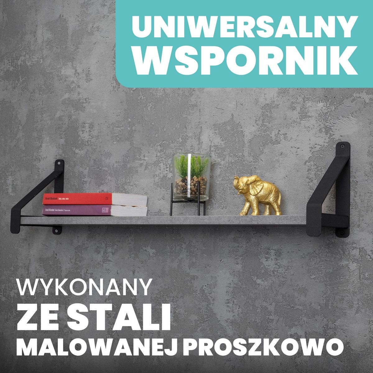 Wspornik do półki podpora czarna - WFC to eleganckie i nowoczesne rozwiązanie do montażu półek w stylu industrialnym i loftowym. Produkt wykonany z wysokiej jakości stali, wykończony w matowej czerni, gwarantuje solidność oraz stylowy wygląd. Zestaw składa się z dwóch wsporników: lewego i prawego, co pozwala na stabilne zamocowanie półki i równomierne rozłożenie ciężaru. Dzięki minimalistycznemu designowi doskonale sprawdzi się w nowoczesnych wnętrzach, dodając im charakteru. Idealny wybór do salonu, sypialni, kuchni czy biura, gdzie funkcjonalność spotyka się z estetyką. Wsporniki można łatwo zamontować, a ich konstrukcja pozwala na długotrwałe i bezpieczne użytkowanie.